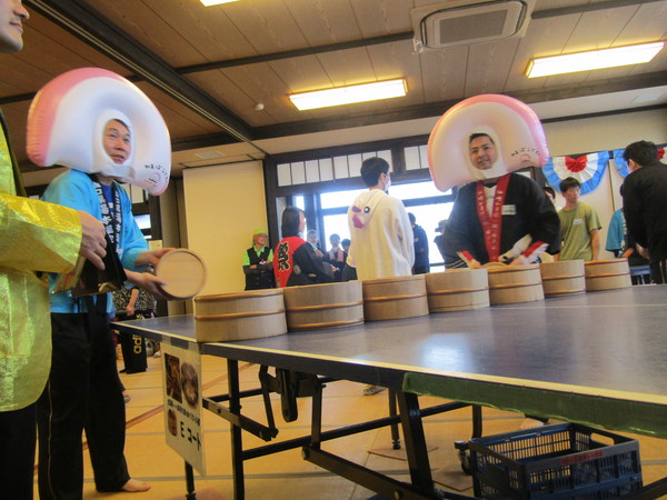 かまぼこの被り物をした男性二人が桶で卓球をしている写真 拡大画像 (JPEG: 88.8KB)