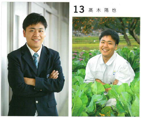 漫才コンビ「アグレッシブ」の高木君が、1枚は、教室の前で腕を組み、もう一枚は緑の葉に囲まれ腕を組んでいる写真 拡大画像 (PNG: 293.8KB)