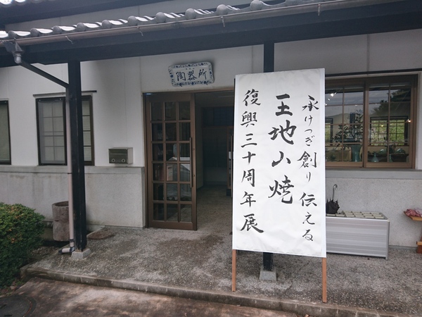 陶器所の入り口に「承けつぎ創り伝える 王地山焼 復興陶器所三十周年展」と書かれた看板の写真 拡大画像 (JPEG: 123.1KB)