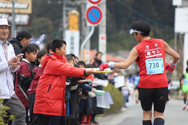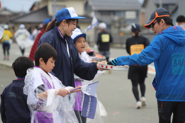走ってくるランナーに沿道からお皿に入った食べ物を差し出しているユニフォームと帽子を被った子供たちの写真 拡大画像 (JPEG: 180.7KB)