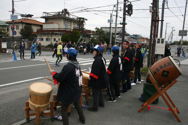 沿道脇で頭にハチマキをした男性や帽子を被った女性が太鼓を叩いて応援している写真 拡大画像 (JPEG: 181.5KB)