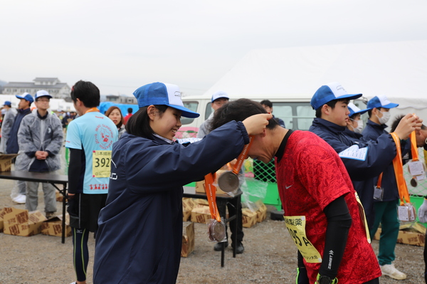 帽子を被った女性が赤のTシャツを着たランナーにメダルをかけている写真 拡大画像 (JPEG: 137.2KB)