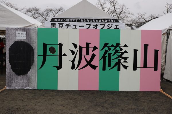 左端に黒い玉のようなもので丸く描かれた物と丹波篠山と書かれた文字の看板が設置されている写真 拡大画像 (JPEG: 132.6KB)