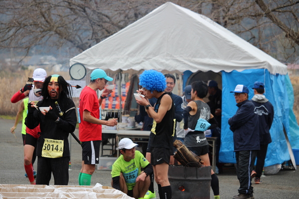 青色のアフロを被ったランナーや殿様の被り物をしたランナーの方が出された「しし汁」を美味しそうに食べている写真 拡大画像 (JPEG: 166.6KB)