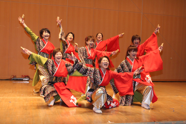 女性のグループがよさこいを踊って最後に声を出してポーズを決めている様子の写真 拡大画像 (PNG: 420.8KB)
