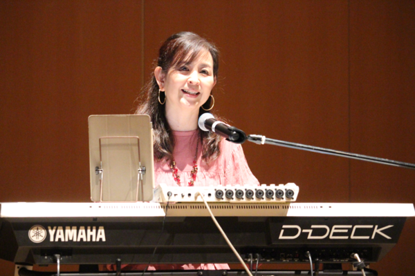 髪の長い女性が歌いながらキーボードを弾いている写真 拡大画像 (PNG: 388.0KB)