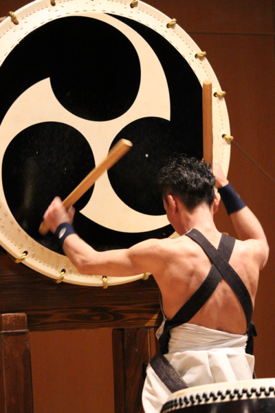 男性が笑顔で肩に下げた太鼓をたたいている写真 拡大画像 (PNG: 395.9KB)