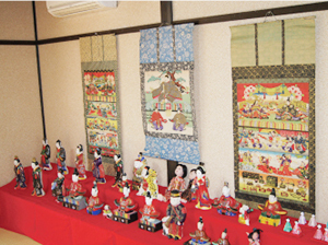 2列に並べられたひな祭りの人形と、その後ろに掛けられた掛け軸の写真 拡大画像 (JPEG: 97.4KB)