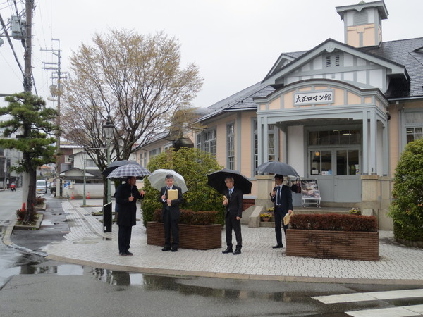 大正ロマン館の前で視察に来られている伊丹副局長さんと関係者の皆さんが傘をさして写っている写真 拡大画像 (JPEG: 93.2KB)