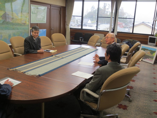 市長室にて、市長の前に伊丹副局長さんが座っており、市長と話をしている様子の写真 拡大画像 (JPEG: 73.2KB)