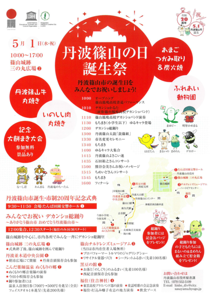 当日は午前10時から篠山城跡三の丸広場で誕生祭を開き、歌、書道パフォーマンス、ふれあい牧場、ゆるキャラ集合などいろんな催しがあります。