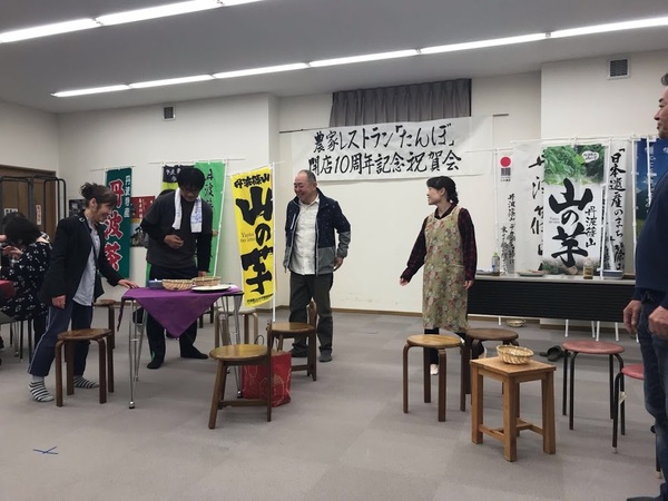 農家レストランたんぼ開店10周年記念祝賀会と書かれた紙が壁に貼ってあり、山の芋と書かれたのぼり旗が飾ってある部屋に6名ほどの人達が立っている写真 拡大画像 (JPEG: 87.7KB)