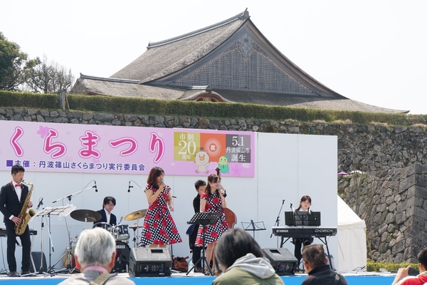 さくらまつりの舞台でバンドの演奏に合わせて女性2名が歌っている写真 拡大画像 (JPEG: 170.6KB)