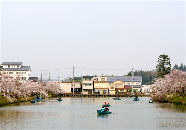 湖の両脇に桜が開花しており、湖のあちこちでボートを漕いでいる人々の写真 拡大画像 (JPEG: 165.6KB)
