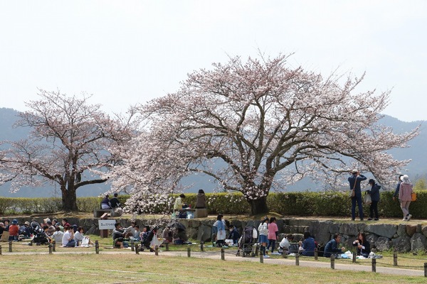 大きな桜の木の下で花見をしている人々の写真 拡大画像 (JPEG: 96.3KB)