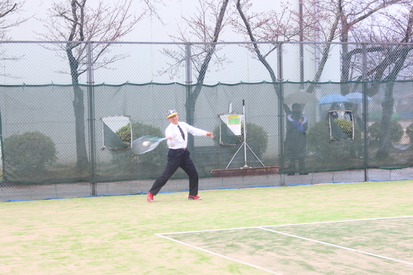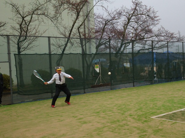 市長の目の前にテニスボールがきて、打とうとしている写真 拡大画像 (JPEG: 97.0KB)