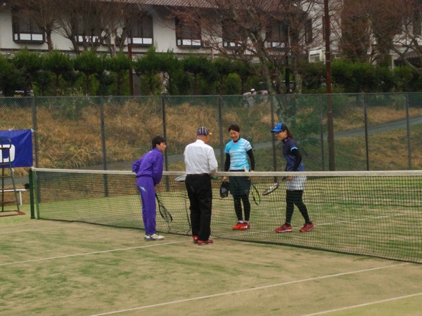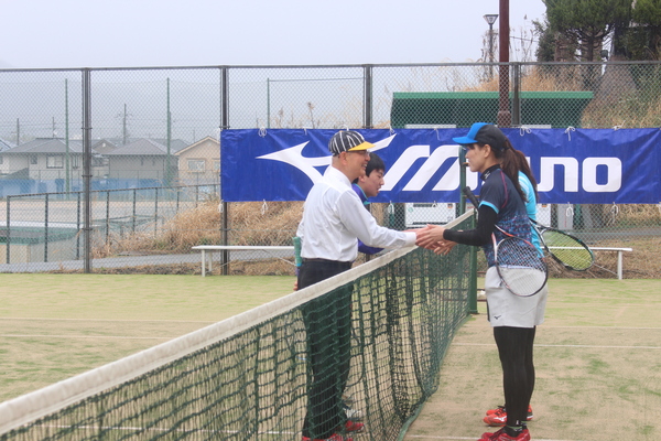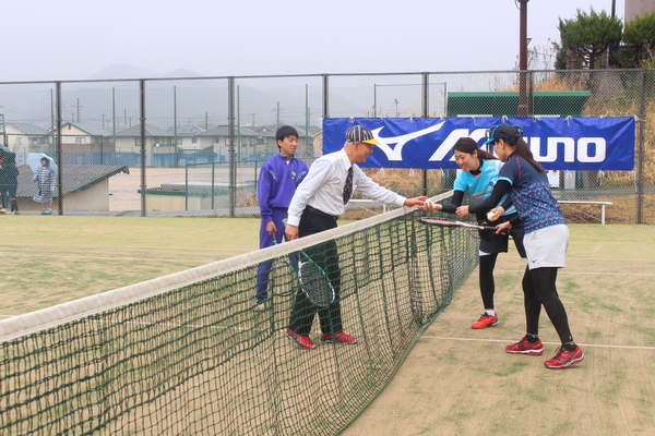 試合が終わり、ネットの前に集まり市長が対戦相手の女性と握手している写真 拡大画像 (JPEG: 181.8KB)
