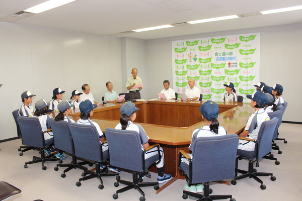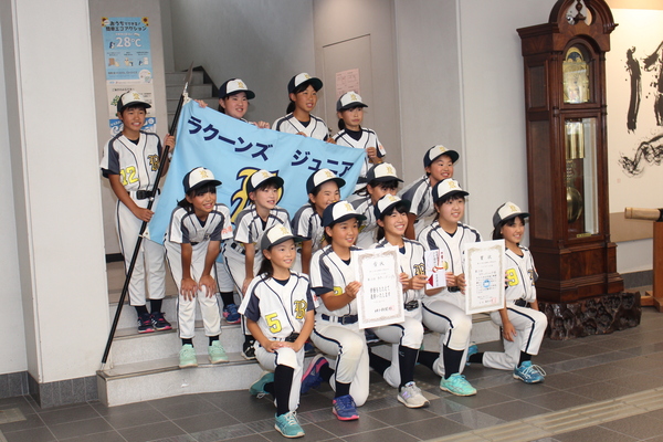 市長と、関係者と、少女ソフトボールチームのラクーンズ・ジュニアのメンバーがユニフォームをきて、会議テーブルに着席している写真 拡大画像 (JPEG: 142.8KB)