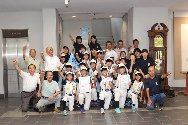 ガッツポーズをする市長、関係者とラクーンズ・ジュニアのメンバーの集合写真 拡大画像 (JPEG: 156.9KB)