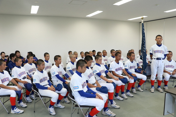 市長から奨励金を受け取る男子選手の後ろにユニフォームを着て座る野球部員の写真 拡大画像 (JPEG: 122.5KB)