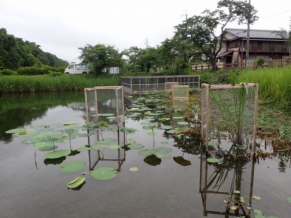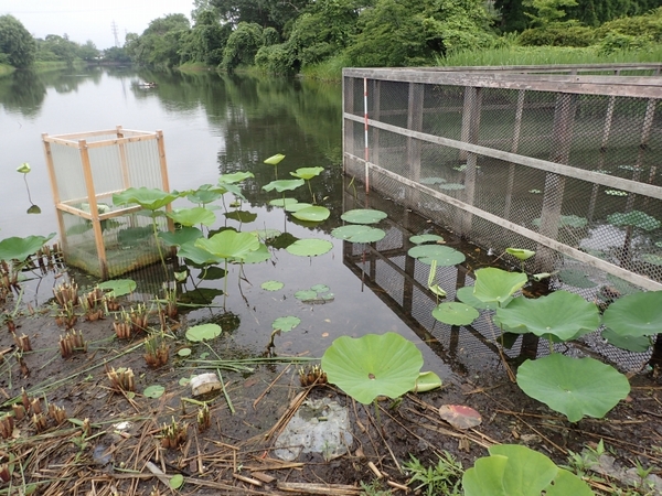 囲われた柵の中の複数のハスの葉が咲いている写真 拡大画像 (JPEG: 237.5KB)