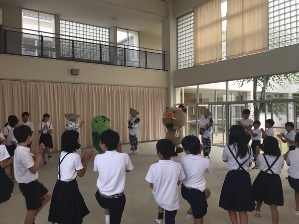 マスコット人形とおけさ傘を頭に被った白色の着物姿の踊り手3名に加わり見様見真似で生徒全員も手拍子をしながら踊りをしている写真真 拡大画像 (JPEG: 86.8KB)