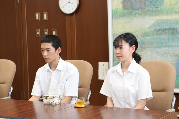 中野一貴さん、小林優希さんが市長室で椅子に座りお話を聞いている写真 拡大画像 (JPEG: 117.7KB)
