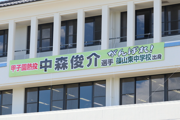 丹波篠山市出身の選手「中森 俊介選手」甲子園出場応援の横断幕が市役所に掲げられている写真 拡大画像 (JPEG: 123.4KB)