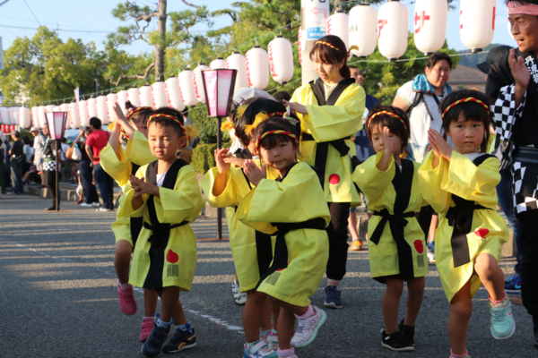 黄色い法被を羽織り頭にねじりハチマキをつけた園児たちが道路を歩きながら踊っている写真 拡大画像 (PNG: 467.8KB)
