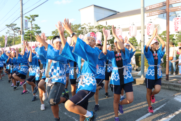 浴衣を着た女の子が法被を羽織り歌いながら踊って、その後ろで男の子たちも一緒に踊っている写真 拡大画像 (PNG: 414.4KB)