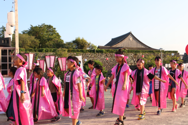 背丈の長いピンク色の法被を着た子供達が声を出してながら歩いている写真 拡大画像 (PNG: 395.8KB)