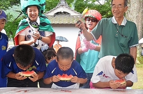 男の子3人がスイカの早食い競争に参加しスイカにかぶりついており、うしろには誰が早いが覗き込んでいる子やスイカのかぶりものをしている男性が写っている写真 拡大画像 (JPEG: 201.6KB)