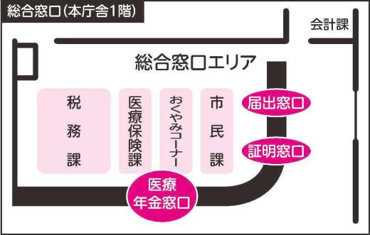 | 医療・年金窓口 | 医療保険課 | 福祉医療、国民健康保険、後期高齢者医療、国民年金 |